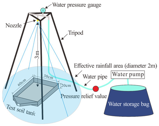 Simulated rainfall experiments were conducted in the rainfall simulation laboratory at Chengdu University of Technology from March to May 2022. During this period, runoff sediment samples were collected and analyzed to study the process and laws of sediment yield on slopes under different conditions of rock fragment embedding. The rainfall device used in experiments comprised a tripod, nozzle, pressure relief valve, water pipe, water pump, and water storage bag. The nozzle model was 1/2HH–50WSQ, produced by Spraying Systems of the United States, with an installation height of 3 m. The rainfall intensity was controlled by adjusting the water pressure through the pressure relief valve, ranging from 20 to 120 mm/h. The effective rainfall area had a diameter of 2 m, and the rainfall uniformity needed to exceed 80% in order to meet the accuracy requirements of artificial rainfall simulation [44]. To facilitate the collection of runoff and sediment, a 0.6 m length, 0.3 m width, and 0.2 m height steel trough was utilized in experiments. The bottom of the trough was evenly punched with a hole 5 mm in diameter, and a collecting groove was welded to the lower end of the trough (Figure 5).