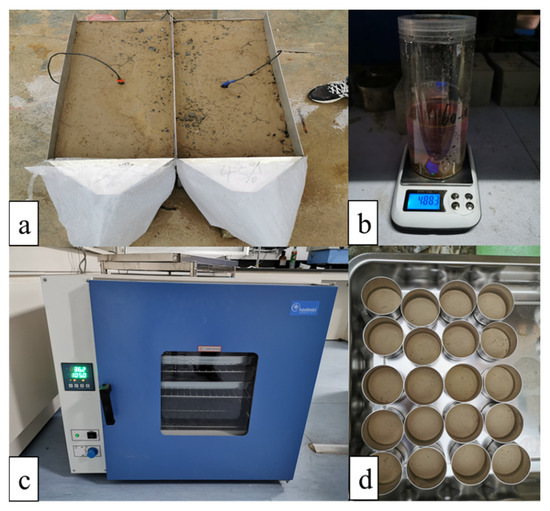 (6) After the slope generated runoff, a 30 min period was dedicated to surface runoff and sediment collection. The time was carefully recorded using a stopwatch. Samples were collected at intervals of 2 min, and the mass of sediment-containing runoff was measured using a highly precise electronic scale, with an accuracy of 0.1 g. Subsequently, the collected sample was allowed to stand for 8 h, facilitating the natural stratification of sediment and water. After this process, the supernatant was carefully poured out, and the wet sediment was extracted and placed into an aluminum box. In order to accurately quantify the sediment, it was subjected to a drying process in an oven at 105 °C for a duration of 8 h (Figure 6).