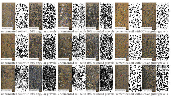 (2) To ensure the quality of sample preparation, digital image processing technology was used to control the variation in rock fragment-specific surface area and spatial arrangement among URGSS, UAGSS and CAGSS. The test was conducted when the difference was less than 3% (Table 3), and the spatial arrangement characteristics were similar. The following steps were performed: (1) Obtain the image data of the sample; (2) Perform geometry correction and airspace enhancement through Photoshop CS5; (3) Use binarization processing through Image J and Photoshop CS5 to remove excess noise, fill in the internal missing stones, generate fine binarized images, and obtain the spatial arrangement characteristics of rock fragments; (4) Read the number of rock fragment cells and calculate the rock fragment-specific surface area.