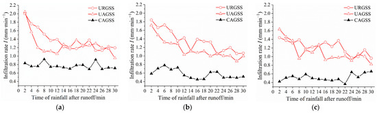Figure 8 shows that the infiltration rate of the URGSSs and UAGSSs gradually decreased as rainfall time increased. The infiltration rate decreased rapidly between 6 and 12 min after the initial runoff generation on the slope. Between 12 and 30 min after runoff generation on the slope, the infiltration rate gradually stabilized, and the fluctuation range became narrow. In the early stage of runoff generation, the infiltration rate of the UAGSS and URGSS was similar. However, as rainfall continued, the infiltration rate of the URGSS gradually exceeded that of the UAGSS. The overall infiltration rate of the slope decreased with the increase in the rock fragment content, which can be attributed to the lower permeability of rock fragment compared to soil.