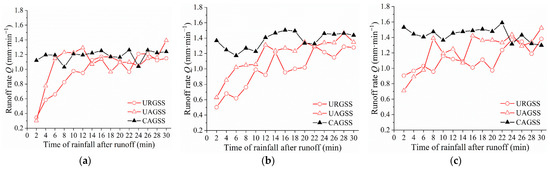 The runoff rate of URGSSs and UAGSSs changed with time in two stages: (1) a rapid increase stage, where the runoff rate increased rapidly when the initial runoff of the slope was about 14 min; however, the increase in the runoff rate gradually decreased with increasing rock fragment content; (2) a flat increase stage, where the runoff rate gradually tended toward a gentle increase trend and slowly increased with small fluctuations after 14 min of runoff generation. In contrast, the fluctuation amplitude of the runoff rate of the CAGSS with time decreased slightly. After stabilization, the runoff rate of the CAGSS was generally greater than the UAGSS, shown in Figure 9.