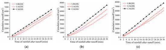 The average runoff rate of the UAGSS was greater than that of the URGSS, and the gap between the two gradually increased with the increase in rock fragment content. On the other hand, the average runoff rate of the CAGSS was greater than that of the UAGSS. The fluctuation amplitude of the average runoff rate enlarged with the increase in rock fragment content. The overall runoff rate of each slope increased with the increase in rock fragment content. The cumulative runoff gap between the UAGSS and URGSS was small at the beginning of the runoff. However, the gap between the two gradually broadened with increasing rainfall time (Figure 10), which was also observed between CAGSS and UAGSS.
