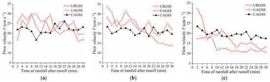 In the early rainfall stage, the thin-layer water flow encountered less resistance because the slope was relatively flat, resulting in a large flow velocity. However, with the extension of rainfall time, the water flow energy consumption of the uncemented slope increased due to the increase in the amount of sediment carried by the water flow increase, resulting in the flow velocity fluctuating and decreasing. The rill erosion continued to develop, and the tortuosity of the rills increased, leading to the collapse of the rill walls and causing the sediment content of the runoff to grow rapidly. This process consumes much water flow energy, constantly decreasing flow velocity. In the later stage of rill development, the rill shape tended to be fixed, and the flow velocity stabilized. Therefore, the process of change in the URGSS and UAGSS can be roughly divided into two stages: (1) The stage of significant fluctuations occurred in the initial stage of rainfall runoff, characterized by a decrease in flow velocity, and accompanied by violent fluctuations; (2) The stage of gradual decline occurred in the later stage of rainfall runoff, where the fluctuation amplitude of flow velocity significantly reduced and showed a slow downward trend (as shown in Figure 11). This was because during the initial stage of rainfall, the slope surface was relatively smooth, resulting in less resistance to the thin-layer water flow on the slope surface and higher flow velocity.