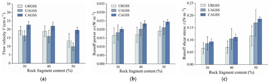 The overall flow velocity change amplitude of CAGSS was smaller than that of the UAGSS. The flow velocity fluctuated with time in a jagged pattern and slowly decreased in the fluctuation. Figure 11 shows that the time for the flow velocity to stabilize became shorter as the rock fragment content increased. In addition, with the increase in rock fragment content, the slope flow velocity of the UAGSS and CAGSS decreased to varying degrees, and the runoff shear stress and runoff power increased to different degrees (Figure 12). Compared to the UAGSS under the same rock fragment content conditions, the flow velocity of the URGSS was larger, but the runoff shear stress and runoff power were less. However, compared to the UAGSS under the same rock fragment content conditions, the flow velocity, runoff shear stress, and runoff power of CAGSS were greater.