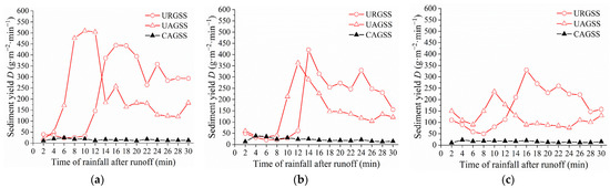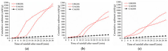 The cumulative sediment yield of the URGSS and UAGSS exhibited a pattern of initial slow increase, followed with a rapid increase, and then another period of slow increase. As the rock fragment content increased, the rate of increase in cumulative sediment yield became more stable, and the initial cumulative sediment yield was slightly higher. During the initial stage of runoff generation, the cumulative sediment yield of the UAGSS was greater than that of the URGSS. However, in the later stages of the runoff generation, the cumulative sediment yield of URGSS gradually surpassed that of the UAGSS. Furthermore, it was observed that the higher the rock fragment content, the earlier the exceedance occurred. This indicates that the rock fragment content had a greater impact on the erosion capacity of the rill on URGSS compared to the UAGSS. Overall, the cumulative sediment yield of the URGSS was approximately 20% higher than that of the UAGSS. On the other hand, the cumulative sediment yield of CAGSS increased slowly and steadily over time, although it remained significantly lower than that of UAGSS. Additionally, it was observed that the rock fragment content slightly impacted on the cumulative sediment yield of the CAGSS (Figure 14).
