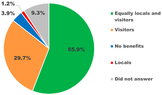 In the quantitative survey, 55.9% of respondents (in this case the opinion of local residents) considered the benefits of the national park to be equally distributed between local residents and visitors. However, a significant percentage (29.7%) felt that the benefits are mainly enjoyed by visitors (Figure 5). Few respondents considered that there were no benefits from the park (3.9%).
