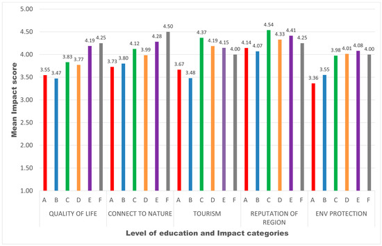 Perceptions of impacts between different educational groups. X-axis labels of education level: A—Volks-/Hauptschule; B—Mittlere Reife; C—Abitur; D—Fachhochschulabschluss; E—Hochschulabschluss; F—Promotion. See Table 1 for explanation of the education levels.