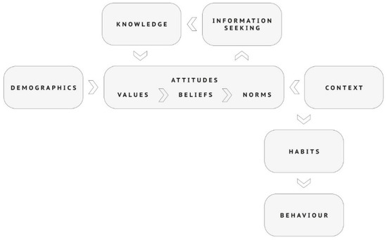 According to Alphabet theory, attitudes are influenced by Demographics, Knowledge and Context (Figure 1). Furthermore, Information seeking of conscious consumers depends on their individual values, beliefs and norms and lead to more in-depth knowledge about the environment and agricultural practices. For example, a broader knowledge of organic production systems leads to a higher motivation to buy organic products [45]. Habits are influenced by the Context and the attitudes leading to individual behaviour. Consumers, who are aware of the origin of their food and know places where to buy them, show that their values, beliefs and norms influence their food purchase habits and behaviour [45].
