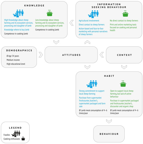 Foodies are knowledgeable about cooking and sheep farming and valued the taste of lamb meat highly. Because of their agricultural involvement, they know shopping outlets for regionally produced lamb meat, and they are highly motivated to change their consumption behaviour towards actively supporting extensive sheep farming systems. This target group is especially suitable for direct marketing and personal story telling of the sheep farmers. The “Rhön lamb” in Germany is a best-practice marketing example that attracts Foodies by promoting meat quality and story of origin, product identity [64].