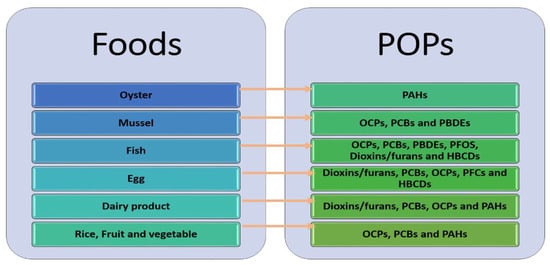 Upon release into the atmosphere, POPs settle onto vegetation, soil and sediments. They subsequently bioaccumulate in aquatic fish and farm animals through the ingestion of contaminated feed, plants and sediment. As marine and freshwater organisms exhibit higher concentrations of POPs compared to their surrounding aquatic environment, they serve as valuable bioindicators. For the majority of individuals not occupationally exposed to POPs, the primary route of exposure (>90% of POP intake) stems from the consumption of animal products and seafood. Additionally, exposure can occur through the consumption of fruits and vegetables treated with pesticides, which serve as an additional source of exposure [4,14]. Figure 1 presents some of the reported POPs in foods in previous studies.