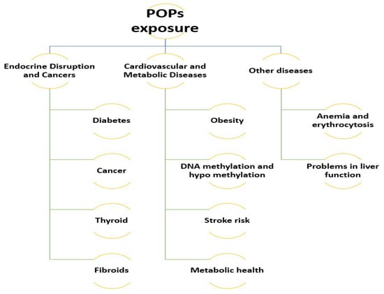 A variety of types of diseases have been reported to be caused by POPs. The associated diseases are classified into two categories, (1) endocrine disruption and cancers, and (2) cardiovascular and metabolic diseases [4]. In addition, another classification includes additive and synergistic effects, reproductive problems, endocrine disruption and cardiovascular problems [7]. The reported diseases in South Korea that have been associated with POPs are classified and explained in the following discussion. Figure 2 demonstrates the reported diseases in South Korea that have been linked with POPs.