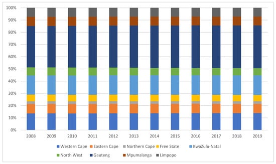 As stated in the literature and policy documents, social justice and consideration for potential effects on jobs and local economies must guide the timing of the shift to a low-carbon economy []. South Africa’s high unemployment levels magnify the risks of job losses resulting from transitioning coal out of the supply mix. The choice of technology and the scale and speed of adoption of renewable energies will have consequences that vary across economic sectors and geographical regions. Mpumalanga is the province in South Africa where most coal power plants are located. A shift away from coal will significantly affect the Mpumalanga economy, which represents around 8% of the South African economy (Figure 1), and employment levels in the mining sector in South Africa (Figure 2).