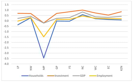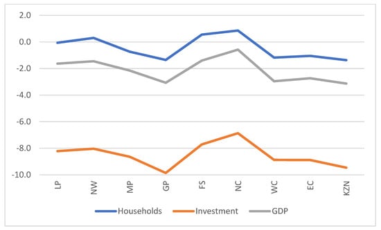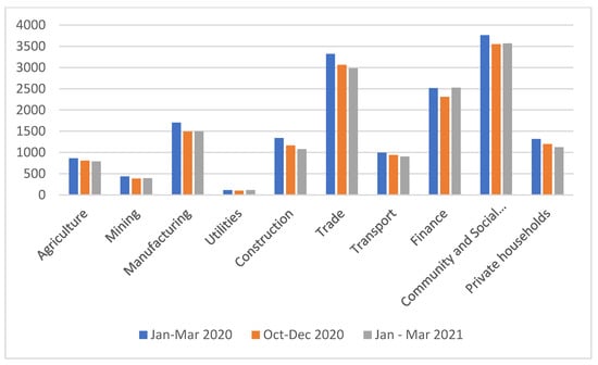 The short- and long-run consequences of the COVID-19 pandemic have not affected everyone in a homogenous way []. Chitiga et al. [] show that the impact of the responses to limit the spread of COVID-19 in South Africa, such as lockdowns and restricted international travel, had devastating effects on several sectors of the economy. Gross Domestic Product (GDP) substantially fell, and employment was decimated. It was found in the study that the most harshly affected were unskilled workers, those with primary school education or less. This finding of the heavier impact on unskilled workers is important, because these workers could not telework like other, more skilled workers. Women were also among the most negatively affected as they tended to be employed in service sectors, such as tourism, which suffered extended total closures []. The results showed that the ultra-poor, who usually depended on social grants, which continued during COVID-19, were somewhat shielded and could stay at the same poverty levels while a new poor group emerged. One of the recommendations from these studies was that it was important for policymakers to ensure that this new poor group, consisting mainly of unskilled workers and women, should not be left behind in crafting stimulus policies.
