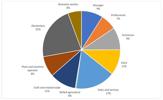 Bohlmann et al. [] argued that the energy transition’s effects are not one-dimensional among South Africa’s provinces due to the distribution of coal mines and coal-fired power plants (as shown in Figure 3, which highlights how the majority of South Africa’s power plants are located in one province—Mpumalanga). The impact of switching to an energy supply mix with a lower share of coal generation is dependent on other economic and policy circumstances, mainly how the global coal market responds and, as a result, how much coal South Africa exports. Under conditions in which surplus coal resulting from lower domestic demand cannot be readily exported, the economies of coal-producing regions in South Africa, such as the Mpumalanga province, are the most severely affected. The subsequent migration of semi-skilled labour from that province to others within the country requires appropriate and timeous planning by energy policymakers and urban planners (refer to Figure 4, which shows that semi-skilled labour forms a big proportion of the South African labour force).