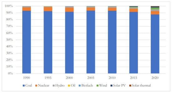 As a result of the country’s abundant coal reserves and consistent domestic coal production, South Africa predominately uses coal-fired power generation to meet its electricity generation needs. Fossil fuel-derived generation accounted for almost 80% of the total energy supply and around 80% of electricity generated in South Africa in 2019. This has been consistent since the 1990s [,,] (see Figure 5 and Figure 6).