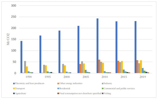 CO2 emissions by sector (Mt CO2). Source: IEA [].