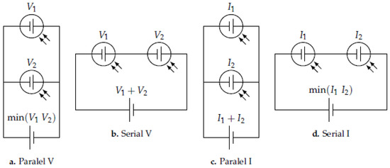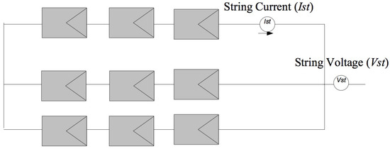 A solar PV array is defined in a matrix by columns of panels connected in series and linked together by parallel connections (Figure 4). The array will try to produce the highest energy intensity under a constant voltage, whatever the prevailing weather conditions. The various factors affecting this output (dust, bird droppings, or shading) can significantly unbalance the output and decrease it considerably.