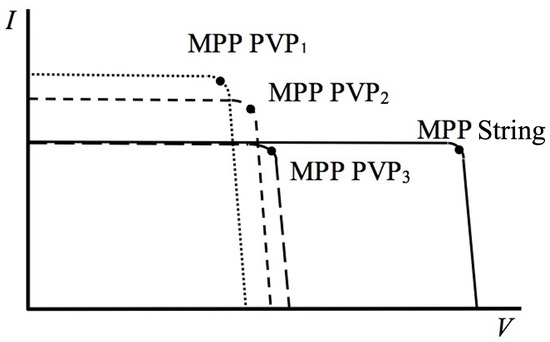 This unbalance causes some panels to work at different maximum power points on their corresponding current–voltage curves (I–V curve). The panel in the worst condition will decrease the performance of the whole column by modifying the overall maximum power point (MPP) to a lower value [8,9]. In Figure 5, it can be seen how the string current at the MPP (solid line) is limited by the MPP current of the third PV (The acronym refers to the analysis of the MPP curves on a set of three photovoltaic panels, referring to Photovoltaic Panel 1 (PVP1), Photovoltaic Panel 2 (PVP2), Photovoltaic Panel 3 (PVP3), and the complete array (String)).