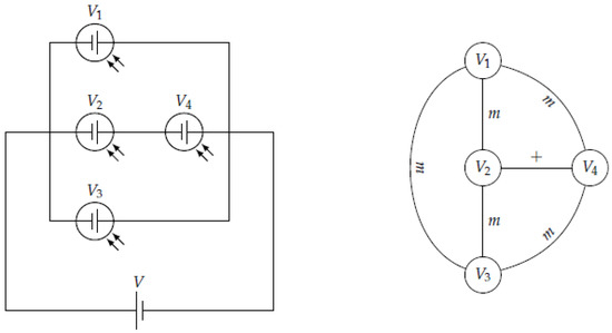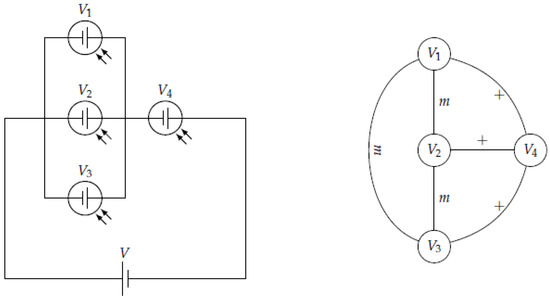 Dijkstra’s algorithm has usually been used in its original version, i.e., to calculate the minimum path between two points [11,12]. However, in this case, to calculate voltages and intensities between points in a novel way, the algorithm itself will be reprogrammed. Let us first establish a notational parallelism to pass these circuits to graphs, considering in each vertex the value to be studied (voltage or current) and, in the edges, the operation carried out (minimum = m and sum = +). Two examples of transforming a circuit to a graph could be the following (Figure 7 and Figure 8):