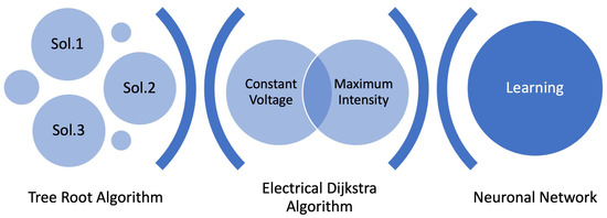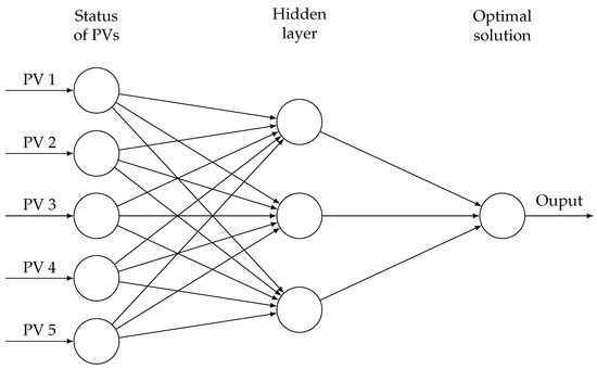 Once the possible solutions (solution space) have been chosen, their measurement by means of the electric Dijkstra algorithm will give the objective function with which to achieve the optimal solution. This solution can be registered, by means of artificial intelligence, as the solution of a multilayer neural network. The inputs will be the different production states of the solar panels and the output will be the solution found, which will be implemented (Figure 11). This system will provide the permanent knowledge and learning to the system of choice of solutions.
