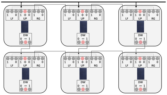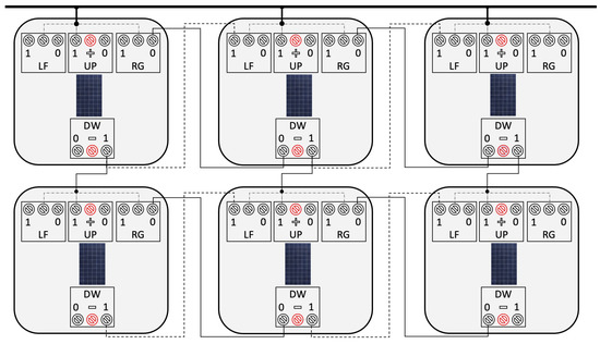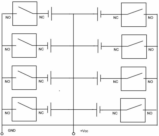 The solution found (Figure 16) proposes to use basic relays as a tool to establish a connection or to suppress it. Electrically, what is proposed is to use the energy generated in each of the sets of photovoltaic cells that make up the panel as a power supply to activate the switching of the panel’s own relay that will control the connection of the panel to the set of panels in parallel, adding its intensity to that generated by the other panels, or disconnecting that panel from the set (in the event of a decrease in the voltage or intensity generated).