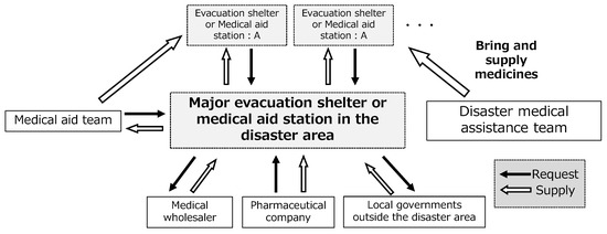 The Tohoku earthquake off the Pacific coast that occurred in March 2011 in Japan had a magnitude of Mw9.0 and caused enormous damage to the country. This earthquake and its after-effects are collectively referred to as the Great East Japan Earthquake. This earthquake led to a large number of human casualties and enormous medical needs. Owing to the tsunami and the radiation problems at the Fukushima Daiichi Nuclear Power Plant, the scope of damage has increased as the victims have lived in shelters for significantly long periods. During the aftermath of the Great East Japan Earthquake, patients with chronic diseases had greater medical needs than those suffering from injuries [1,2]. Drugs are essential for treating patients with chronic diseases. However, when the Great East Japan Earthquake led to a massive number of victims, the drug needs of each patient could not be properly grasped and consolidated, owing to a mismatch between drug supply and demand at first-aid centers and evacuation shelters [1]. Figure 1 shows the main scheme of the drug supply system followed in Japan in the event of a disaster. When a large-scale disaster occurs, disaster medical teams such as DMAT, JMAT, and JRCS play central roles in medical support. Each team brings medical supplies as relief and provides medical care at evacuation shelters and first-aid centers. These teams also treat patients with chronic diseases and prescribe medicines and drugs. Medical supplies are also supplied by drug wholesalers, drug companies, and local governments outside the disaster-affected area. Drugs delivered to disaster-affected areas are accumulated in large-scale evacuation shelters and first-aid centers, which also serve as distribution centers, from where they are distributed to smaller evacuation shelters and first-aid centers. Decisions regarding the request and supply of medical supplies in the disaster area are made by the local government officials who manage the evacuation centers and the dispatched doctors and pharmacists. In addition, the Disaster Countermeasures Headquarters established in the disaster-stricken area make decisions on the general framework, such as requests for dispatching doctors and setting up evacuation shelters. As described above, there are two major drug supply routes during disasters. The supply and demand balance of drugs is not optimized because the needs of disaster victims are not properly determined in this supply route.