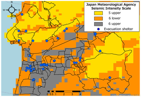 Here, we explain the concerns regarding the largest earthquake disaster that is assumed to hit Hakui City, Ishikawa Prefecture, in the future. The Japan Seismic Hazard Information Station (J-SHIS) [14] provides seismic hazard maps specifying seismic source faults, thus enabling the specification of seismic source faults that are expected to result in large seismic intensities in Hakui City. In addition, the seismic intensity distribution when an earthquake occurs on the specified fault can be determined. This study considers the case where a large-scale earthquake occurs in the Ochigata fault zone, which is expected to generate greater vibrations and shaking in Hakui City. Figure 3 shows the magnitude of the seismic intensity that Hakui City would experience when an earthquake with an asperity of Case 4 among the earthquakes assumed by J-SHIS occurs in the area, with additions made by the author to the data provided by J-SHIS. From Figure 3, the instrumental seismic intensity can be determined in 250 m mesh units; however, it can be seen that it is assumed that the entire Hakui City area would be struck by strong shaking of 6 lower and 6 upper. The earthquake that is assumed to occur in the Ochigata fault zone has a maximum Mw of 7.0 and a 50-year occurrence probability of 3.17% [14].