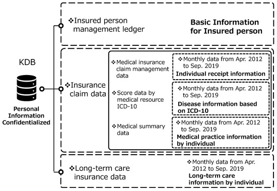 The KDB consists of medical, health, and nursing care information provided to all municipalities in Japan to support the creation and implementation of data health plans in line with the PDCA cycle. Figure 4 shows the structure of the data provided by the administration of Hakui City to the authors. The KDB is broadly divided into three groups of data: insured person management ledger, insurance claim data, and long-term care insurance data. All these data were ID-coded to prevent information from being identified and processed such that addresses can only be determined up to the town level. These data groups can be used to obtain information on medical, health, and nursing care on an individual basis. The insured person management ledger contains the IDs of persons enrolled in national health insurance in Hakui City, the address up to the town level, age, and date of national health insurance enrollment or loss; it can be referred to as a list of insured people recorded in the KDB. Insurance claim data are divided into medical insurance claim management data, score data by medical resource ICD, and medical summary data. These are data for which insurance claim information is accumulated for each medical practice. Data such as the ICD-10 code, which is an international classification standard for diseases, injuries, symptoms, patient conditions, and medical practices, as well as the code of the medical institution visited and prescribed drug names, can be determined for each individual. Additionally, long-term care insurance data are data where the contents of long-term care services received by those who have been certified as requiring long-term care in Japan as well as the incurred costs are recorded. All data have been accumulated on a monthly basis since April 2012. The authors could access the data from April 2012 to September 2020 from Hakui City.