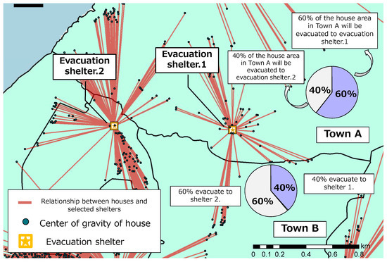 Additionally, we describe the method for estimating the number of evacuees to designated evacuation shelters in the analysis of Step.2. In this analysis, the location–allocation analysis by ArcGIS [15] was used for estimating both cases. Location–allocation analysis is categorized as a transportation network analysis, and it is a method for calculating the optimal facility layout from the relationship between the candidate location of the facility and the demand site (movement cost, attractiveness of facility, and supply capacity of facility). In this analysis, the center of gravity of a house in Hakui City was selected as the candidate site for the facility, and the designated evacuation shelters shown in Figure 2 and Figure 3 were used as the demand sites. Additionally, the costs to be set were such that the travel distance between the candidate point (center of gravity of the house) and the closest demand site (designated evacuation shelter) was the shortest. Figure 5 shows a diagram of the specific estimation method. First, the nearest designated evacuation shelter was selected from all the houses in Hakui City from the location–allocation analysis. The nearest evacuation shelter was determined for all houses by implementing this analysis. Subsequently, the ratio of the selected evacuation shelters to the total house area within the town was calculated. The number of epileptic patients per town, calculated from the KDB, was divided proportionally with respect to this ratio, and the number of evacuees to each designated evacuation shelter was estimated. This method is used for estimating evacuees to the designated evacuation shelters for epileptic patients calculated from the KDB.