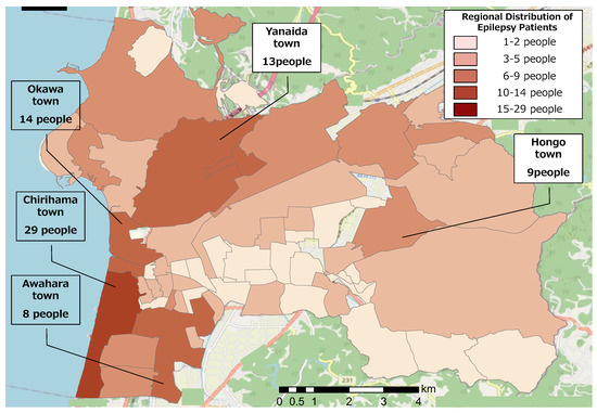 The KDB for the three months of July, August, and September 2020 was used to calculate the number of people taking antiepileptic drugs in Hakui City, which yielded a total of 267 people. Figure 6 shows the population distribution in 65 towns in Hakui City. The darker colors in the figure indicate that a greater number of people are taking antiepileptic drugs in the town. Based on the results, there were many people taking antiepileptic drugs in the southwestern part of Hakui City. The town with the most epileptic patients was Chirihama Town, with 29 patients. Near Chirihama Town, there were 8 epileptic patients in Awara Town, and 14 in Okawa Town, indicating that epileptic patients were mostly concentrated in the southwestern part of Hakui City. Additionally, there were 13 epileptic patients in Yanagida Town and 9 patients in Motoe Town, indicating that epileptic patients were scattered and living in towns relatively far from the southwestern part of Hakui City as well. The regional distribution shown in Figure 6 shows real numbers, not percentages of the population. This is because, in terms of disaster prevention engineering, it is important to pinpoint the exact number of epileptic patients residing in each town, as the information on the specific number of people is usually deleted when indicating the population ratio within the town.