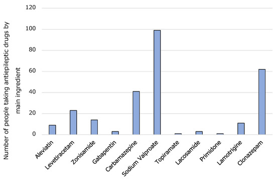 Figure 7 shows the details of the main ingredients of the prescribed antiepileptic drugs for the antiepileptic drug users calculated from the KDB. Of the 267 people, 99 (approximately 37.1%) were confirmed to be using antiepileptic drugs that contain sodium valproate as the main ingredient. Sodium valproate is a drug that is widely used as a first-line treatment and is mainly used for treating generalized epileptic seizures. As a general rule, this drug is contraindicated for administration to pregnant women or women who may be pregnant and requires relative caution. It can also be confirmed that 62 people (approximately 23.2%) were taking antiepileptic drugs containing clonazepam as the main ingredient. As a general rule, this drug is contraindicated to patients with acute angle-closure glaucoma or myasthenia gravis. Further, 41 people (approximately 15.4%) were taking antiepileptic drugs containing carbamazepine as the main ingredient. This drug is often used as a first-line treatment for partial-onset epileptic seizures. Furthermore, 23 people (approximately 8.6%) used levetiracetam, and 14 people (approximately 5.2%) used zonisamide, indicating that various antiepileptic drugs were used. As described earlier, we used the KDB to clarify the population distribution of antiepileptic drug users by town and the major ingredients of the antiepileptic drugs that they were taking. As mentioned above, antiepileptic drugs have many contraindications in principle, and the amount and type of antiepileptic drugs are generally determined with utmost care. In the event of a disaster, victims are placed in situations where epileptic seizures are likely to occur due to stress and lack of sleep. Therefore, doctors and pharmacists who prescribe antiepileptic drugs need to be more cautious when prescribing them during disasters when compared to normal times. This analysis showed the calculation results of the main ingredients of antiepileptic drugs for 267 patients as basic information for this purpose.