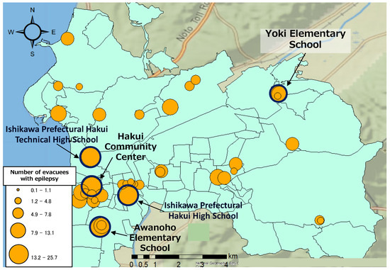 The number of epileptic patients who could evacuate to each evacuation shelter was estimated using the method described in Section 2.3. Figure 8 shows the visualization of the maximum number of epileptic patients who can evacuate to the 40 designated evacuation shelters in Hakui City; these shelters are set as demand sites. Table 2 also shows an example of the top five evacuation shelters with the largest estimated number of evacuees among the 40 evacuation shelters. As shown in Figure 6, the southwestern part of Hakui City is an urban area with a large population. As it is an urban area with a concentrated population, many designated evacuation shelters are present in this area (Figure 3). The results of estimating the number of evacuees showed that the Hakui Community Center near Chirihama Town had the largest number of evacuees, at approximately 25.7 people, followed by the Ishikawa Prefectural Hakui Technical High School (approximately 17.2 evacuees), Ishikawa Prefectural Hakui High School (approximately 16.8 evacuees), and Awanoho Elementary School (approximately 16.7 evacuees). These designated evacuation shelters were areas where the calculations showed many epileptic patients in Hakui City. As shown in Figure 2 and Figure 8, the designated evacuation shelters were also concentrated in this area. However, this estimation suggested that a large number of epileptic patients could be evacuated to the Hakui Community Center, Ishikawa Prefectural Hakui Technical High School, Ishikawa Prefectural Hakui High School, and Awanoho Elementary School. Additionally, in the northeastern part of Hakui City, Yoki Elementary School (approximately 13.1 people) had a large number of evacuees. As the Yoki Elementary School is relatively far from the center of Hakui City, the supply of drugs may be delayed compared to the center. Therefore, doctors and physicians must pay particular attention to the supply of drugs.
