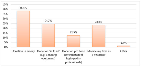 The study commenced with an analysis of the types of donations given. When asked about the types of donations provided, the majority of respondents indicated that they made monetary donations—38% of respondents. A similar assessment of respondents, with a difference of 2%, were donations in kind (e.g., gifts of equipment) (25%) and donations of time as volunteers (23%). The least-used form of donation was pro bono donations, i.e., providing high-ranking specialist advice for free. Furthermore, only 1% of respondents indicated another form of donation, which was a donation of individual shares (see Figure 1).