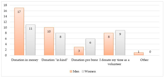 The analysis of the types of donations according to gender is depicted in Figure 2. Figure 2 shows that money donations are made more actively by men (17 respondents out of the total number of respondents), while women are more active with pro bono donations (6 respondents) and volunteers (9 respondents) (see Figure 2).