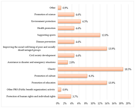 Figure 3 reflects the results of the survey dedicated to corporate donation targets. Public benefit status may be granted to organizations that have been given the opportunity to receive donations to support one of the 13 objectives listed in Figure 3. The highest proportion was achieved by “charity”, which was indicated by 19% of respondents; “raising social welfare of deprived and socially disadvantaged groups” and “promoting education” were in equal second place—14% of respondents. In third place was “supporting sports”—12% of respondents. In fourth place was “promoting culture”, which was indicated by 8% of respondents. Finally, in joint fifth place were several groups of donation targets—“protecting the environment”, “promoting science”, “promoting health”, “disease prevention”, and “developing civil society”—at 5% (see Figure 3).