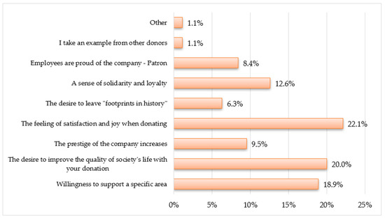 On the other hand, when analyzing the motivation to donate, the most important thing among the respondents was the feeling of “satisfaction and joy when donating” (22% of the respondents). The second most important motivation was “the desire to improve the quality of society’s life with your donation” (20% of the respondents), and the third most important was “the desire support a certain area” (20% of respondents).