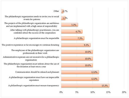 Based on the results of the survey, it should be said that entrepreneurs donated more in terms of money than in donations in kind, or by donating their time as volunteers and providing pro bono services—providing high level consultations free of charge. With their donations, entrepreneurs predominantly supported the following donation goals: charity, improving the social well-being of poor and socially vulnerable groups, promoting education, and supporting sports. It was found to be important for patrons that the philanthropic organization ensures the transparency of its activities, is pleasant to communicate with, has an impeccable reputation, has professional employees, does not have excessive administrative expenses, and informs the patron about the use of the donation at least once a year. It should be emphasized that, in general, it is very important for donors that the philanthropic organization ensures the transparency of its operations and is free in terms of communication, which is one of the most important driving forces for the sustainability of the philanthropic organization.