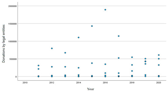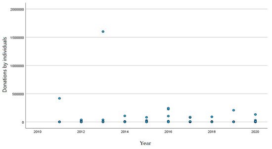 - The Pearson correlation method was used to analyze the data of the Lursoft database of the statistical data portal available in Latvia on the fundraising trends of all philanthropic organizations founded by state universities, in the period from 2011 to 2020, including donations of all philanthropic organizations from individuals and legal entities. The Pearson correlation coefficient is a measure of descriptive statistics. It is a linear measurement between two quantitative random variables that allows us to know the intensity and direction of their mutual relationship [43]. A correlation was calculated that indicated a statistically significant correlation between donations from individuals and legal entities.