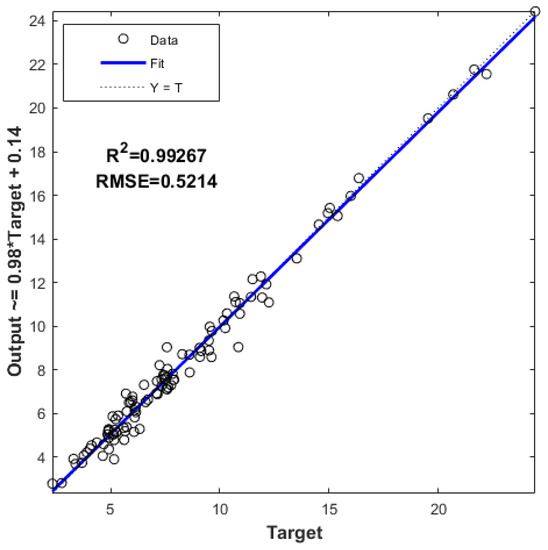- The best model prediction was achieved when all the characteristic parameters with correlation coefficients were selected to construct the yield estimation model, i.e., when the combination of the sea buckthorn colour index and the identified number of fruit and texture characteristics COR were used as model inputs and the actual yield of sea buckthorn fruit was used as output. The model was validated with a coefficient of determination R2 = 0.99267 and root mean square error RMSE = 0.5214. The yield prediction model validation results are shown in Figure 11.