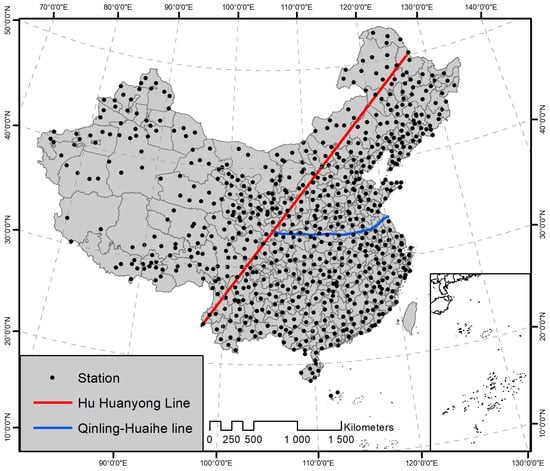 China is situated in the eastern part of the Eurasian continent, spanning latitudes 3°51′ N–53°33′ N and longitudes 73°33′ E–135°5′ E. It covers a land area of approximately 9.6 million km2 (Figure 1). The country’s eastern side is bordered by the Pacific Ocean, while its southwestern side is adjacent to the Qinghai–Tibet Plateau [43]. These diverse geographical features give rise to unique climate characteristics, which can be classified as monsoon climate and continental climate [44]. In China, precipitation is primarily concentrated in the summer season across most regions, while its distribution varies spatially. The eastern parts experience higher precipitation levels compared to the western areas, with a gradual decrease in precipitation from the southeast coast to the northwest inland. This pattern is attributed to the influence of winter monsoons, which are cold and dry, during the winter season, while summer monsoons from the ocean bring warmth, rain, and influence during summer. The vast eastern part of China is greatly affected by the southeast and southwest monsoons, leading to abundant precipitation. Conversely, the inland northwest is less influenced by the summer monsoon and receives sparse precipitation.