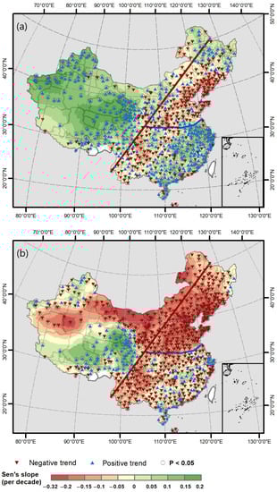 The decadal change and trend of SPI-12 (a) and SPEI-12 (b) in China mainland between 1951 and 2020. The red line indicates the Hu Huanyong Line, and blue line indicates the Qinling–Huaihe Line.