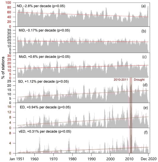 Temporal evolution of the spatial extent of area (% of stations) impacted by multiple drought categories based on the SPEI-12 timescale over mainland China between 1951 and 2020. (Sub-figures from (a–f) are based on Table 1).