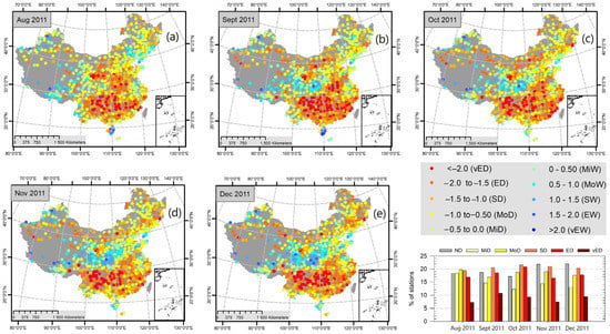 Spatial–temporal variability of SPEI-12 and spatial extent of the extreme drought event that occurred in mainland China from 2010 to 2011. Note: Subpanels from (a–e) indicate the temporal evolution of the 2010 to 2011 extreme drought event.