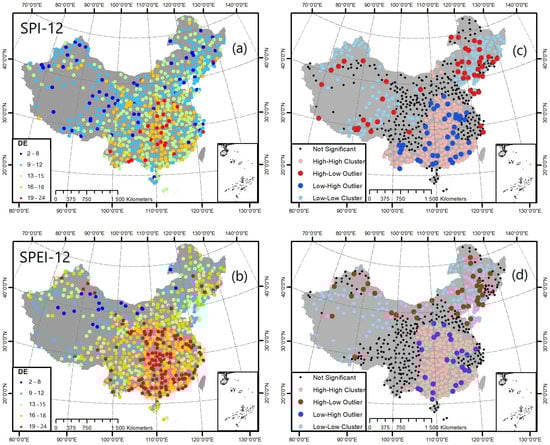 As presented in Table 2, it can be seen that the global spatial autocorrelation of the total drought events (TDEs) based on SPEI12 analysis has a z-score of 27.166, indicating that there is less than 1% chance that this clustering pattern is the result of random chance. On the other hand, as shown in Figure 6b,d, and based on the local spatial autocorrelation of TDE, four spatial patterns were identified. In contrast to SPI results, drought occurrences in China have increased, especially in the northern regions. Drought events in the northwest, Qinghai–Tibet Plateau, and northeast regions are less frequent with two clustering patterns (Low-Low cluster and High-Low outlier). In southern China, drought occurrences are more frequent, with also two clustering patterns (High-High cluster and Low-High outlier).