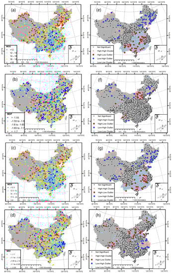 Spatial distribution of MDD, MDP, MDS, and MDI ((a–d), respectively) and the clustering patterns ((e–h), respectively) in mainland China over the past 70 years based on SPEI-12 between 1951 and 2020.