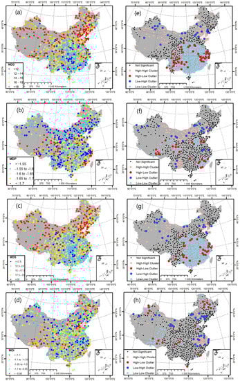 Spatial distribution of MDD, MDP, MDS, and MDI ((a–d), respectively) and the clustering patterns ((e–h), respectively) in mainland China over the past 70 years based on SPI-12 between 1951 and 2020.