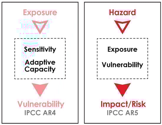 Different approaches within the risk/impact assessment framework: the vulnerability-oriented one (IPCC AR4) on the left and the “risk-based” one (IPCC AR5) on the right (after [8]).