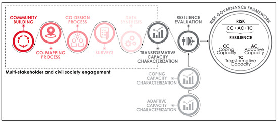 Main steps for resilience evaluation within the Risk Governance Framework. Multi-stakeholder and civil society engagement is crucial for characterizing the Transformative Capacity that, together with the Coping Capacity and Adaptive Capacity, allows for the definition of the resilience of a system.
