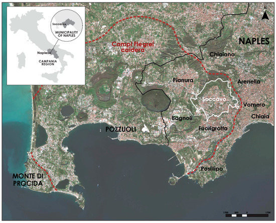 The proposed methodology was tested in the Soccavo district, which, together with Pianura, comprises the 9th Municipality of the City of Naples (Campania Region, Italy). With an overall population of 45,315 inhabitants distributed over 5.11 km2 [51], Soccavo borders the Arenella district to the N-NE, the Vomero one to the E, the Fuorigrotta district to the S-SE-SW, and the Pianura one to the W-NW, administratively. Located in a flat area at 90 m a.s.l., corresponding to one of the craters of the Campi Flegrei caldera, Soccavo is surrounded by the Camaldoli Park hill and Vomero hill, which define its geographical boundaries to the N-NE, respectively [52,53] (Figure 3 and Figure 4).