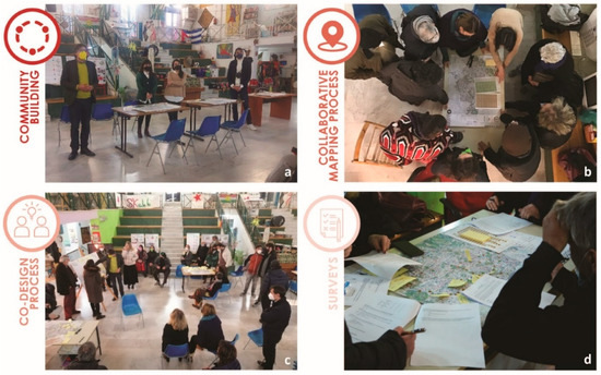 The first step, defined as community building, consisted of interaction (Figure 5a) with inhabitants of Soccavo, with the aim of: (a) describing the main goals and activities of the workshop; (b) defining concepts as geophysical and climate change-related hazards, multi-risk, DRR/CCA measures, and participatory urban regeneration/transformation; (c) overviewing the multidisciplinary research activities carried out by the PLINIVS-LUPT Study Centre, which is also a Centre of Competence for Civil Protection.